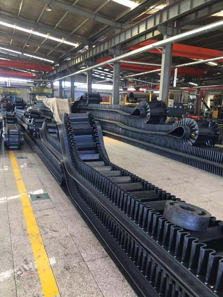 大傾角輸送帶要求具有一定的抗拉強度和耐磨性。其中對留有空邊的大傾角輸送帶,為了適應角度改向的要求,膠帶的縱向要求有柔軟性,橫向則要求有一定的剛性。公司生產的波狀擋邊輸送帶采用特殊結構的橫向剛性基帶,解決了大規格輸送帶在回程過程中塌帶現象。